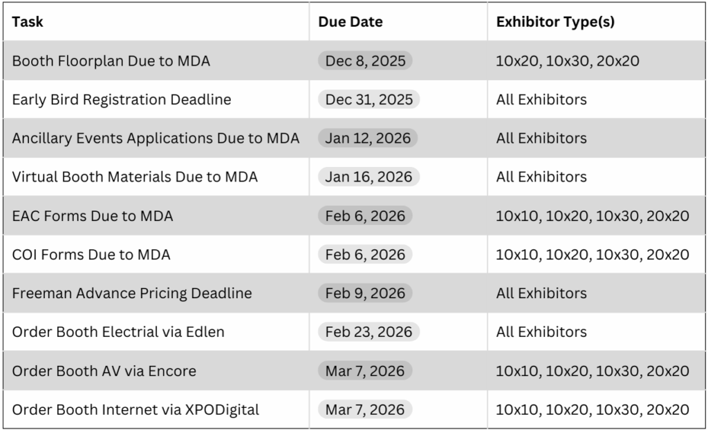 Any company that does not notify MDA of its cancellation by December 15, 2025, or does not occupy its space on-site, will forfeit 100% of its exhibit fee.